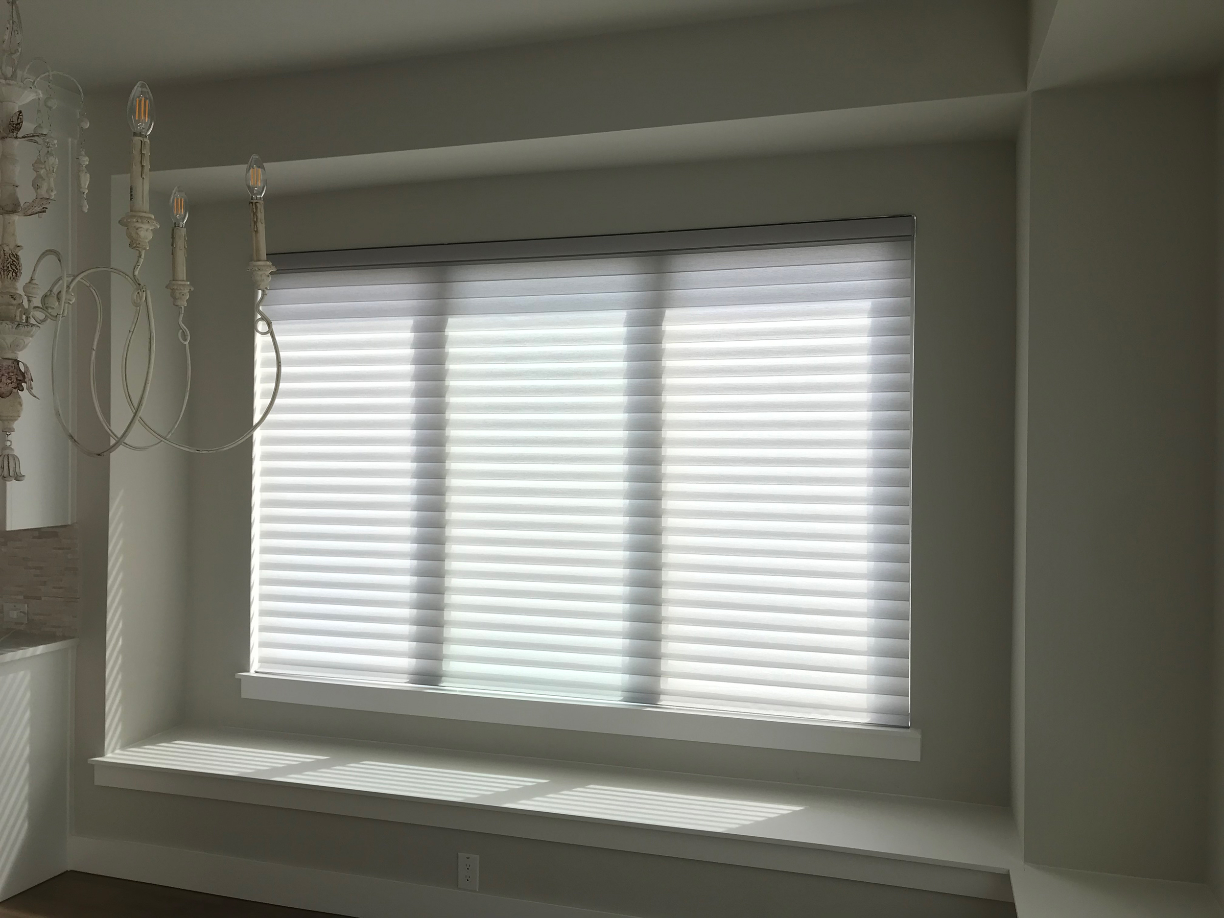 The concept of Silhouette Shadings is similar to the versatility of shutters. A notable difference is the softer look created since the shades are comprised of fabric sheers and vanes. You can open the vanes while the shade is fully lowered for a view that still filters light. The Alustra Collection of these shades contains textured front sheers and metallic accented vanes to offer added elegance to an already beautiful product. For this reason, the family wanted to deviate from shutters for their dining room and create a lighter, more sophisticated atmosphere with their Alustra Silhouette Shadings.