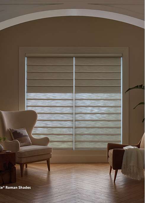 Transform your interiors with the refined beauty of Pirouette™ Window Shadings. These innovative shades feature soft, horizontal fabric vanes that appear to float gracefully over a sheer backing.